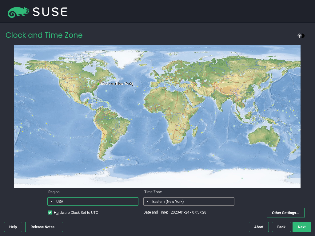 Select the clock and time zone to use in your system. To manually adjust the time or to configure an NTP server for time synchronization, choose Other Settings. See Book “Deployment Guide”, Chapter 4 “Installation steps”, Section 4.11 “Clock and time zone” for detailed information. Proceed with Next.