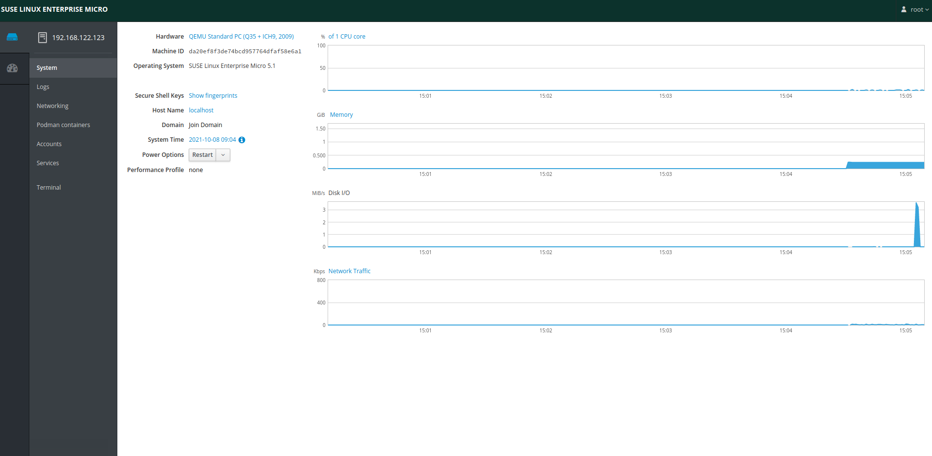 After successful login, an overview of your machine opens. Here you can view and administer your system's performance, network interfaces, Podman containers, services, and logs. You can also access your machine using shell in a terminal emulator.