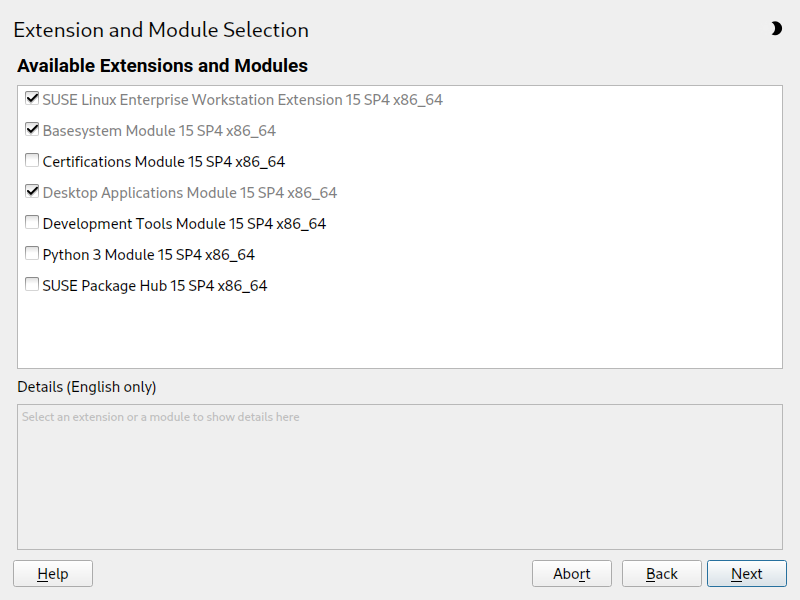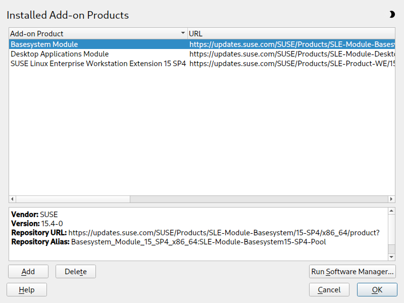 Modules and extensions add features to your system and allow you to customize the system according to your needs. These components also need to be registered and can be managed with YaST or command line tools. For more details also refer to the Article “Modules and Extensions Quick Start”.