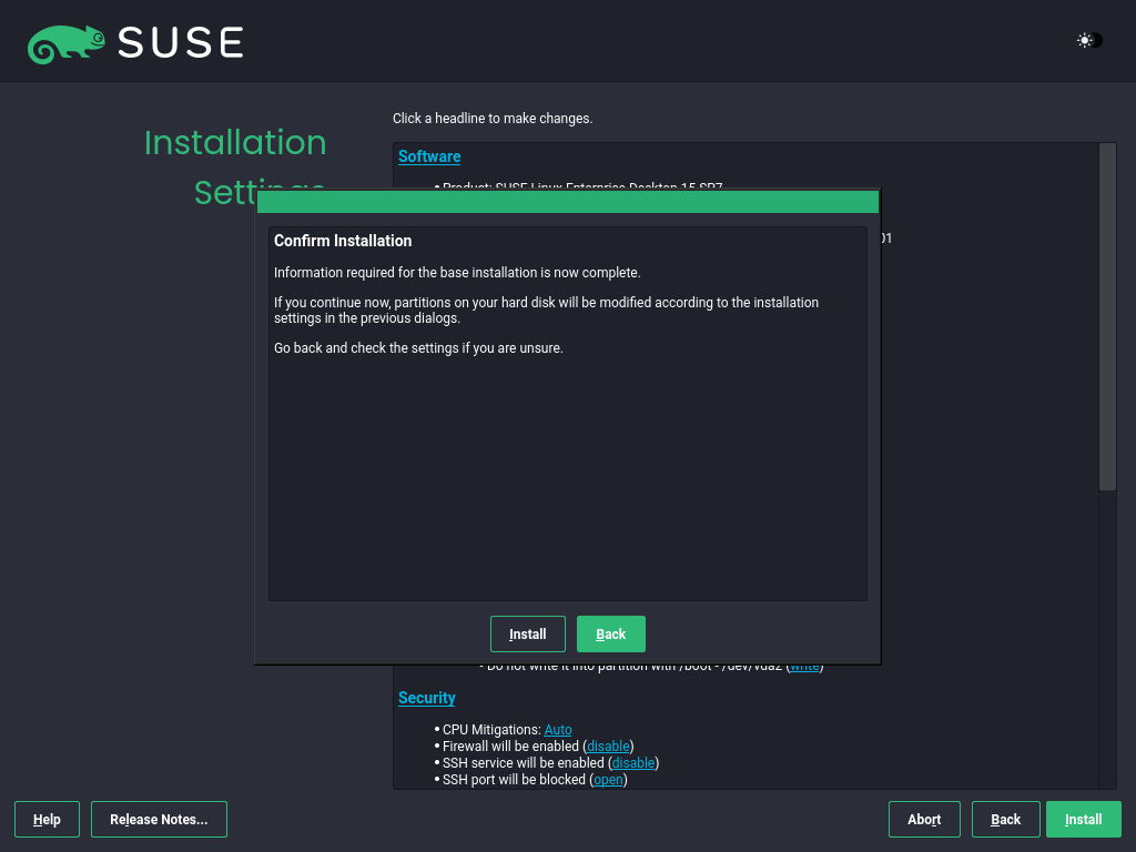 After you have finalized the system configuration on the Installation Settings screen, click Install. Depending on your software selection, you may need to agree to license agreements before the installation confirmation screen pops up. Up to this point, no changes have been made to your system. After you click Install a second time, the installation process starts.