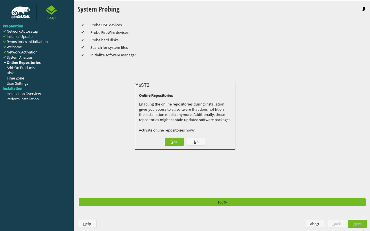 A system analysis is performed, where the installer probes for storage devices, and tries to find other installed systems. If a network connection with Internet access is available, you will be asked to activate the online repositories. Answer with to proceed. In case you do not have Internet access, this step will be skipped.