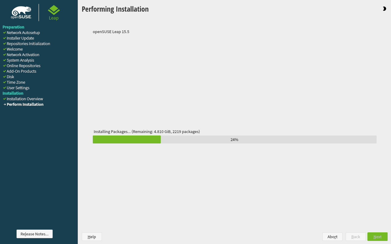 Use the following procedures to install a new version of openSUSE® Leap 15.7. This document gives a quick overview on how to run through a default installation of openSUSE Leap on the x86_64 architecture.