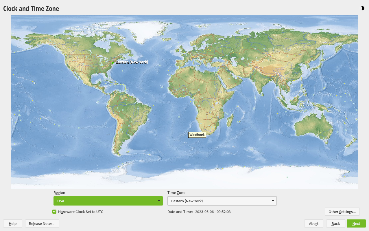 Select the clock and time zone to use in your system. To manually adjust the time or to configure an NTP server for time synchronization, choose . See Section 3.8, “Clock and time zone” for detailed information. Proceed with .