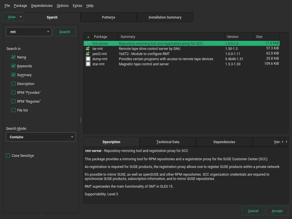 The Repository Mirroring Tool (RMT) for SUSE Linux Enterprise 15 SP7 allows enterprise customers to optimize the management of SUSE Linux Enterprise software updates and subscription entitlements. It establishes a proxy system for SUSE® Customer Center with repositories and registration targets. This helps you to centrally manage software updates within a firewall on a per-system basis, while maintaining your corporate security policies and regulatory compliance.