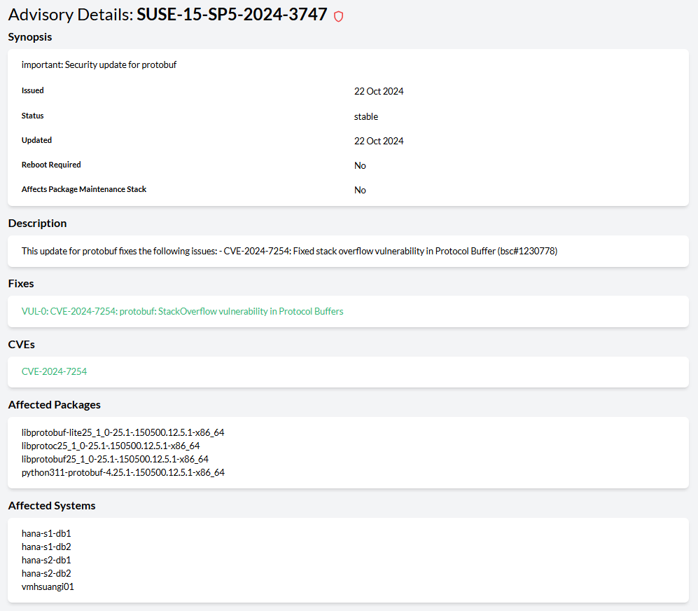 Contextual, detailed overview of available patches and upgradable packages in the SUSE Multi-Linux Manager integration.