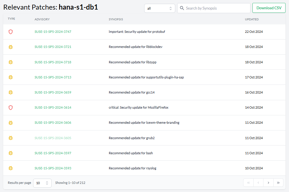 Information about available patches and upgradable packages for each registered hosts via integration with SUSE Multi-Linux Manager.