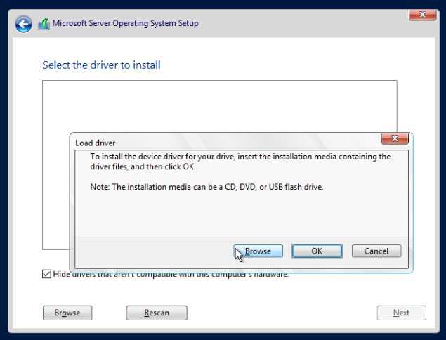 For Windows 2008* and newer, on the screen, select and follow the prompts. This will allow the VirtIO disk driver to be installed for the boot disk.