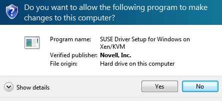 The 64-bit drivers signed only by SUSE can be installed only after the initial Windows installation. Windows must have the Testsigning mode activated for the drivers to load on reboot.